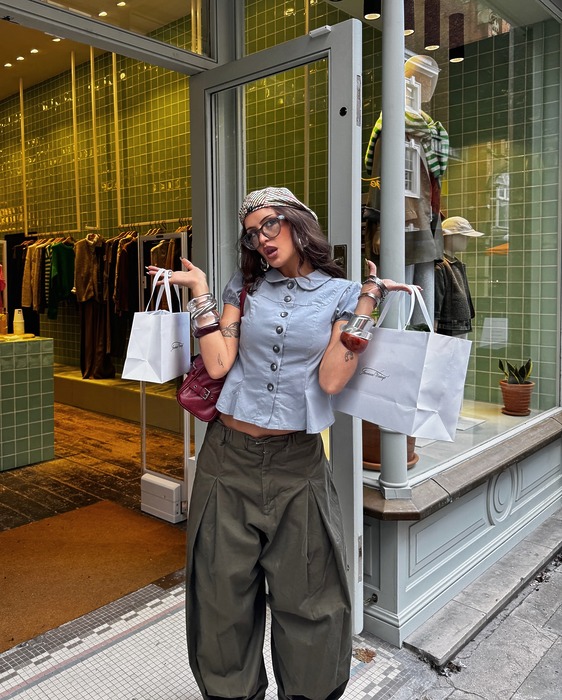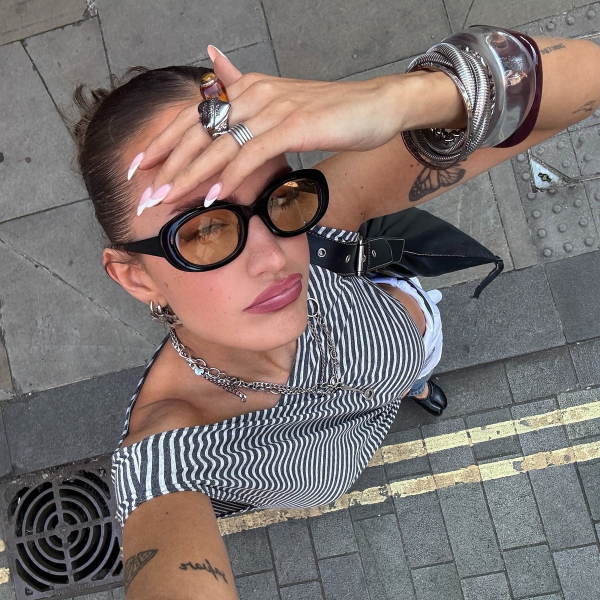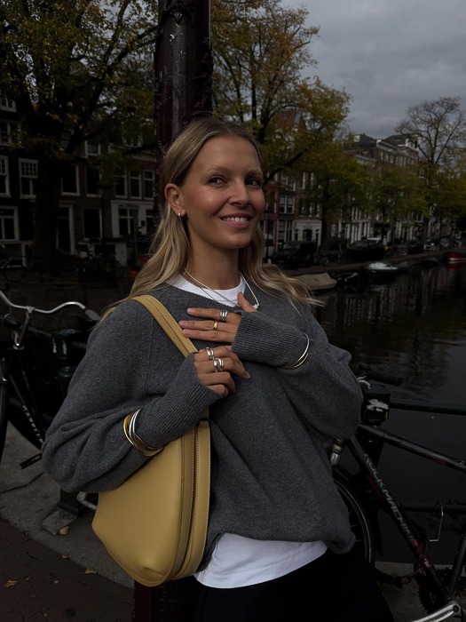 브라운, 투명 레진, 메탈까지 다양한 소재와 컬러의 뱅글을 여러 개 레이어드해 맥시멀 룩을 연출해 보세요. 이때 실버나 투명처럼 채도가 낮은 뱅글을 베이스로 여러 개 깔고, 어두운 컬러의 뱅글을 포인트로 한두 개 섞어주면 산만하지 않으면서도 유니크한 룩이 완성됩니다. 레이어드할수록 중요한 건 기준을 하나 정하는 것. 컬러든, 소재든 한 가지 축은 통일해야 룩이 산만해 보이지 않아요.