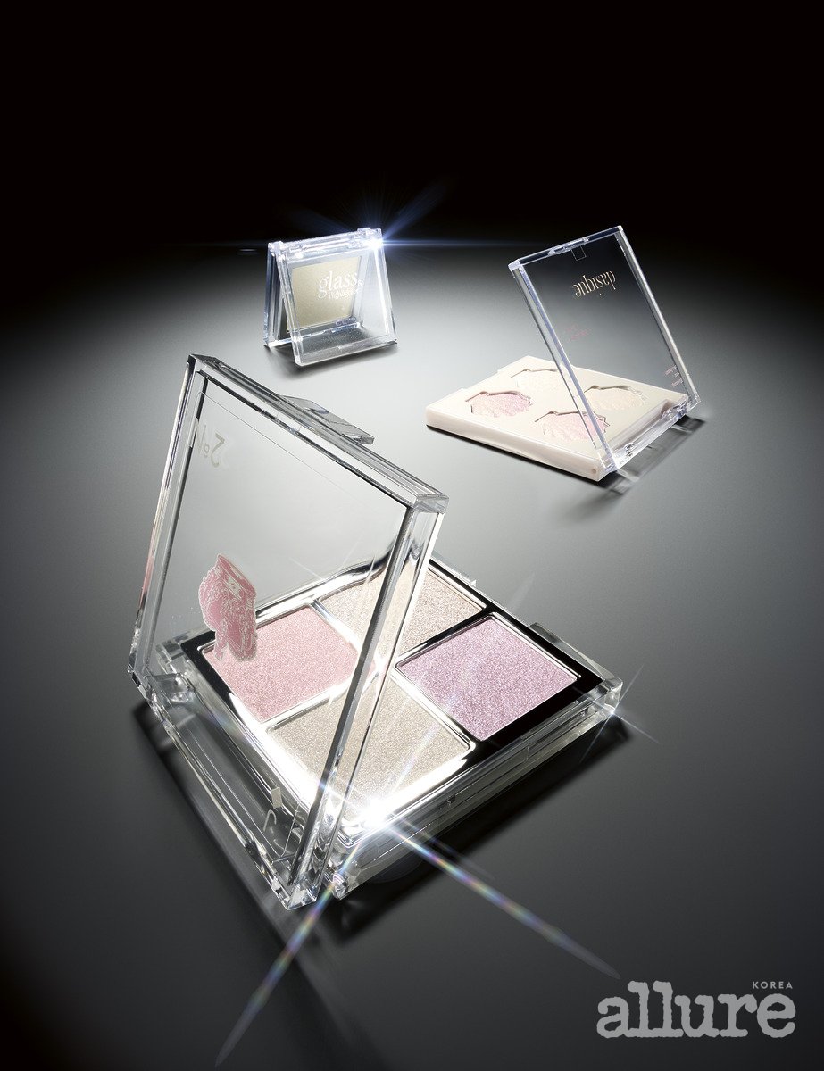 데이지크의 샤인 글로이 하이라이터 팔레트 #01 트윙클 머메이드 가루 날림 없이 피부에 가볍게 안착하며 영롱한 빛을 더한다. 5.6g 2만4천원.