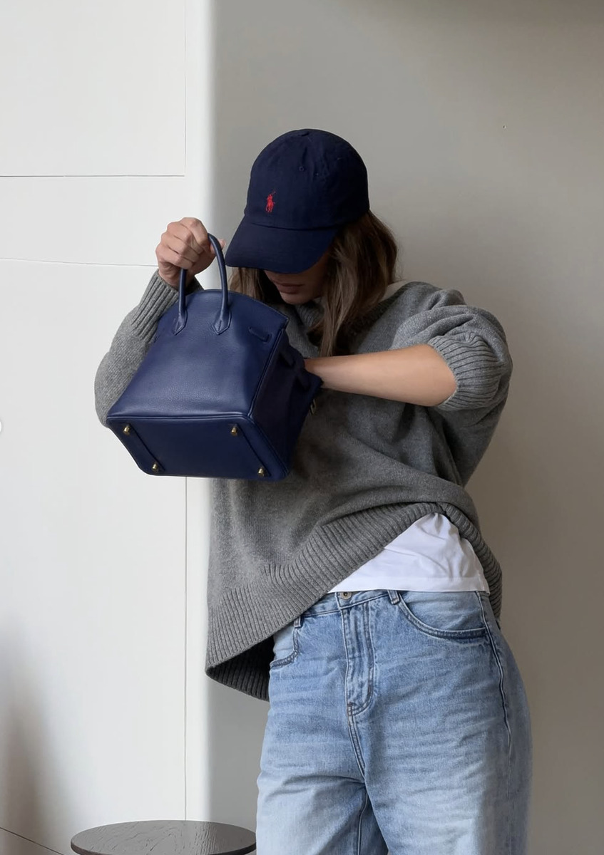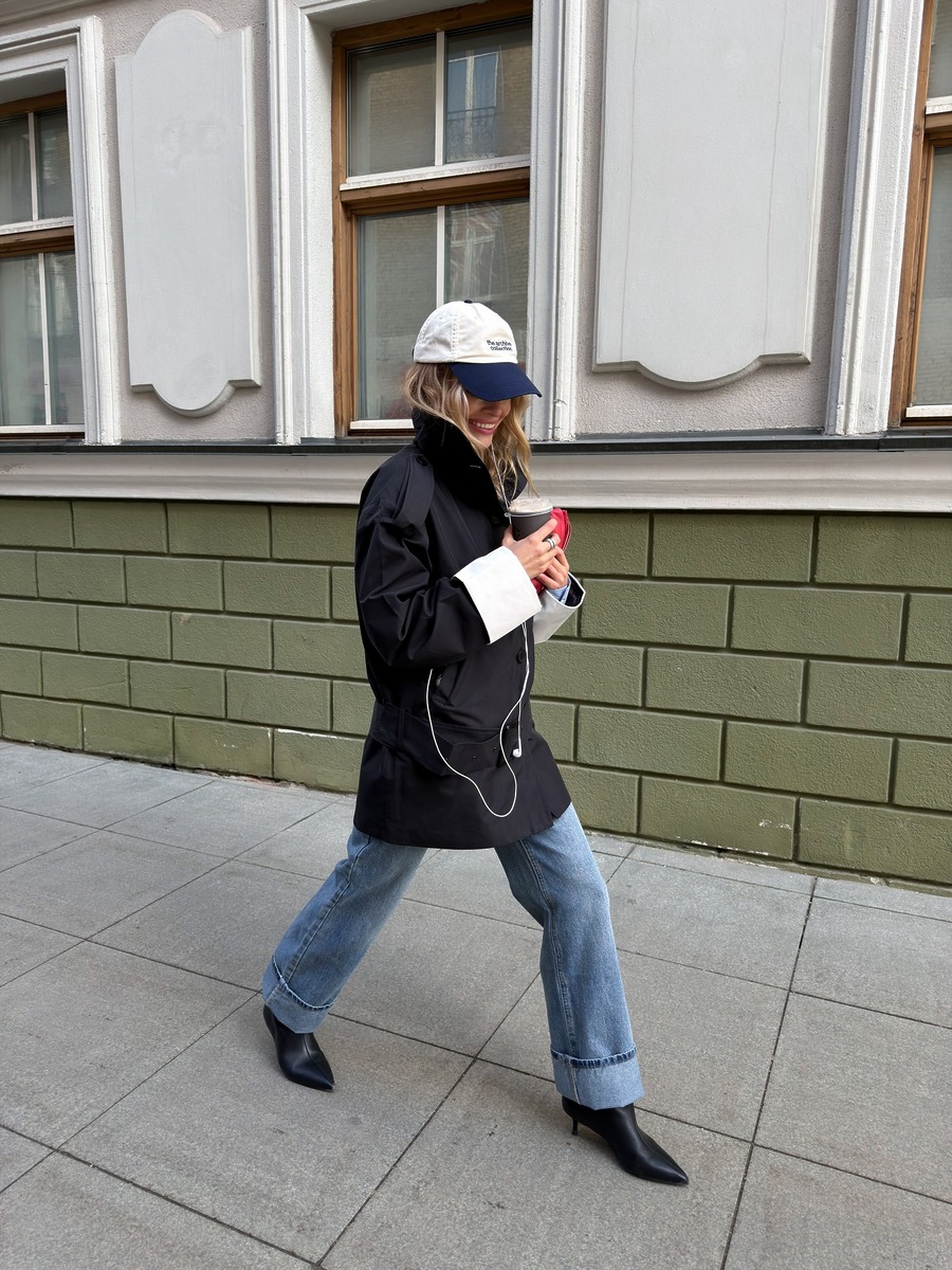 네이비와 아이보리 컬러가 믹스된 투톤 볼캡은 어때요? 작은 레터링 포인트를 더한 모자를 롤업 데님, 블랙 컬러의 미디 기장 트렌치코트와 매치했죠. 심플한 듯 세련된 무드를 완성했답니다.