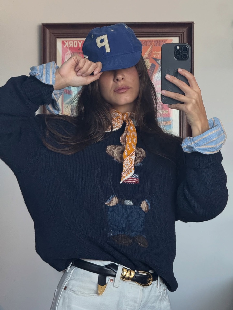 블루 톤의 볼캡은 사실 어떤 스타일에나 무난하게 쓰기 좋아요. 화이트 데님에 블루 컬러가 섞인 셔츠와 네이비 톤의 니트를 레이어드한 룩을 참고해 보세요. 무심한 듯 눌러쓴 파란 볼캡과 패턴 있는 쁘띠 스카프가 귀여운 포인트를 더해주죠.