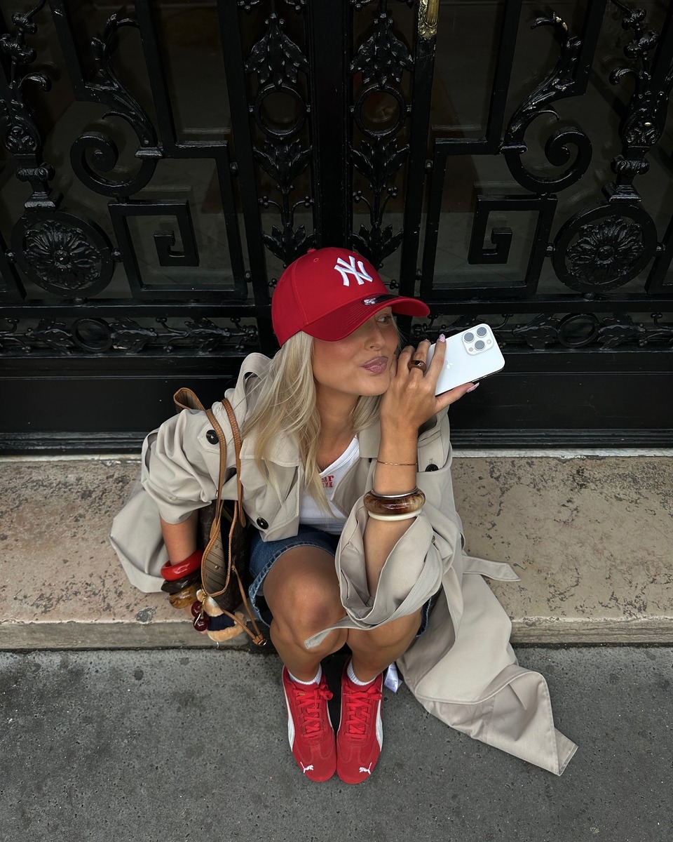 해병대 모자 아니죠, 레드 컬러 볼캡은 진짜 패피들의 필수템. 데일리 룩에 제대로 포인트를 더해주거든요. 이때 스타일에 레드 포인트 아이템을 한 가지 더해보세요. 손목에 빨간 스크런치를 끼운 패피의 룩처럼요! 평범한 트렌치코트 룩에 레드를 더하면 생기를 불어넣어 준답니다. 볼캡, 볼드한 레드 뱅글과 스니커즈를 레드 컬러로 통일 해보세요.