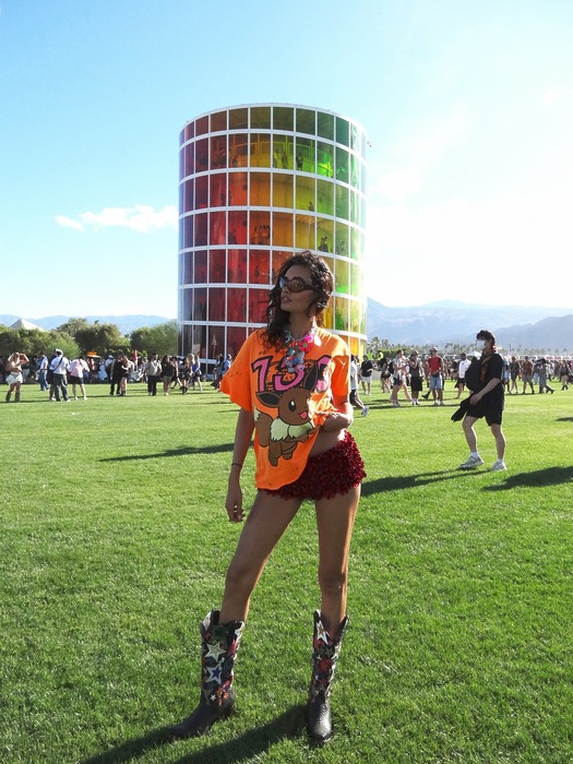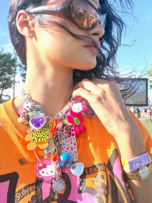 극과 극의 목걸이 활용! 모델 에기는 아슬아슬한 브라톱에 마치 이집트의 여왕들이 할 것만 같은 화려하고 에스닉한 무드의 목걸이를 더해 화려하게 연출해 주었습니다. 반면 모델 지젤은 포켓몬스터의 캐릭터 이브이가 그려진 키치한 티셔츠에 역시나 캐릭터들과 키치한 요소들이 잔뜩 달린 목걸이, 그리고 별무늬 부츠로 마치 팝아트 같은 의상을 선보였어요. 내가 입고 싶은 대로 입는 것, 그것이 뮤직 페스티벌 룩의 답 아닐까요?