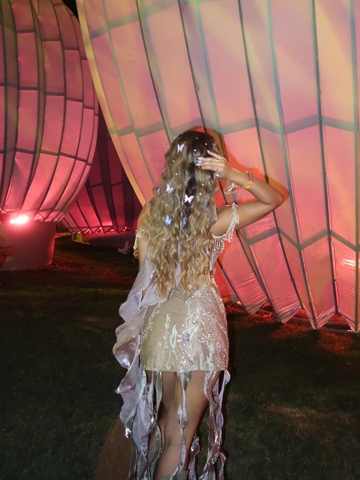 ‘윔지컬 코어‘의 영향일까요? 일상에서는 시도하기 어려운 패션을 선보이는 뮤직 페스티벌이지만 올해에는 더욱 몽환적이고 요정 같은 모습들이 속속 등장했습니다. 패리스 힐튼은 하트 모양의 핑크 선글라스에 플라워 패턴이 잔뜩 수놓인 시스루 드레스를 입고 등장했으며 크리에이터 키마야는 나비 머리 장식과 리본으로 동화책 속에서 튀어나온 듯한 룩을 선보였죠. 앨리 역시 나비 모양으로 구성된 톱과 하늘하늘한 프릴 스커트를 매치했으며 스테파니 휴이는 사랑스러운 코럴 컬러의 크로셰 톱과 미니 스커트 셋업으로 발랄하고 귀여운 무드를 뽐냈습니다.
