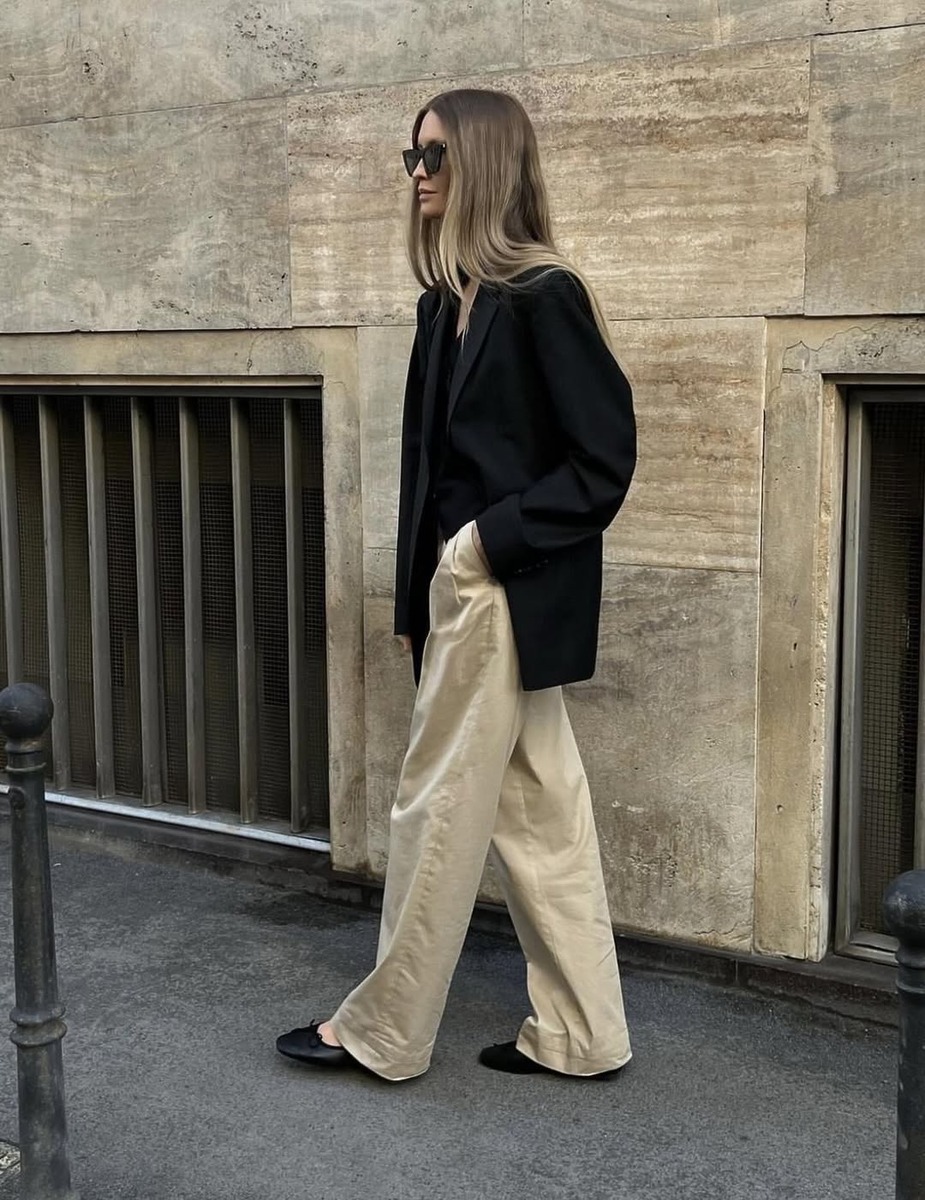 노카라 블레이저와 와이드 밴딩 슬랙스 매칭은 가슴 볼륨이 크신 분들의 구원템이죠. 카라가 없어서 상체가 휑해 보일까 걱정된다면, 이너로 얇은 실크 파인 니트나 스퀘어넥 티셔츠를 매치해 보세요. 하의는 후들후들한 와이드 밴딩 슬랙스를 입으면 하루 종일 뛰어다녀도 될 만큼 편안하지만, 겉보기엔 완벽하게 시크한 수트핏이 연출된답니다.