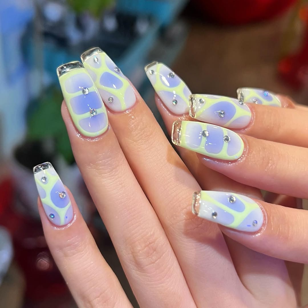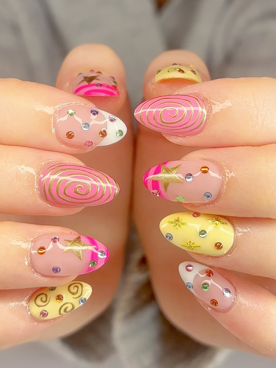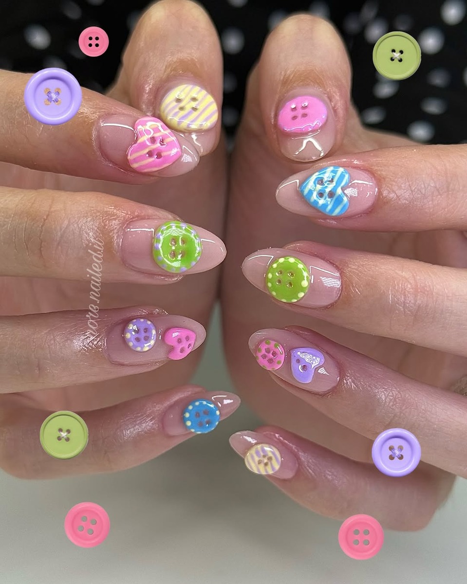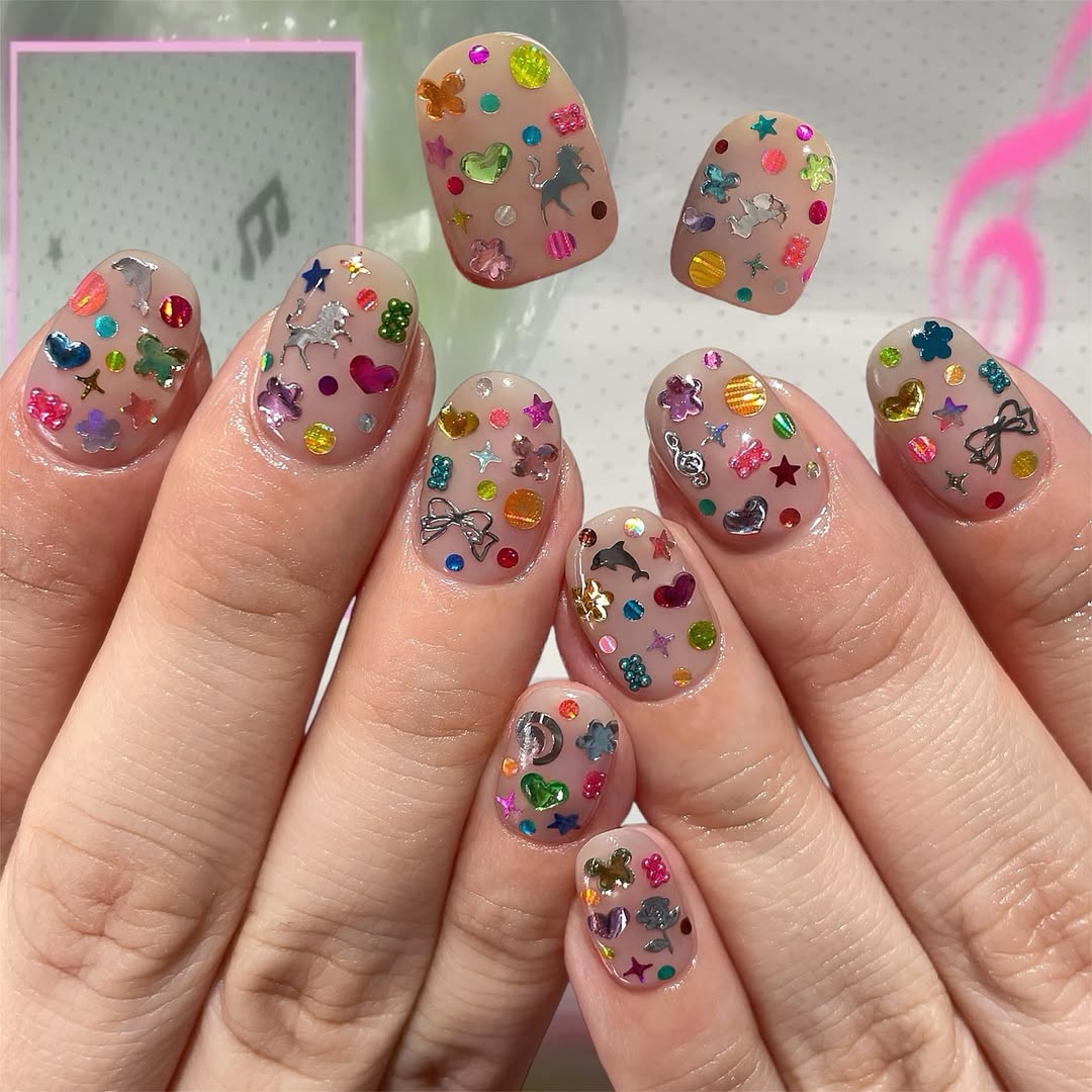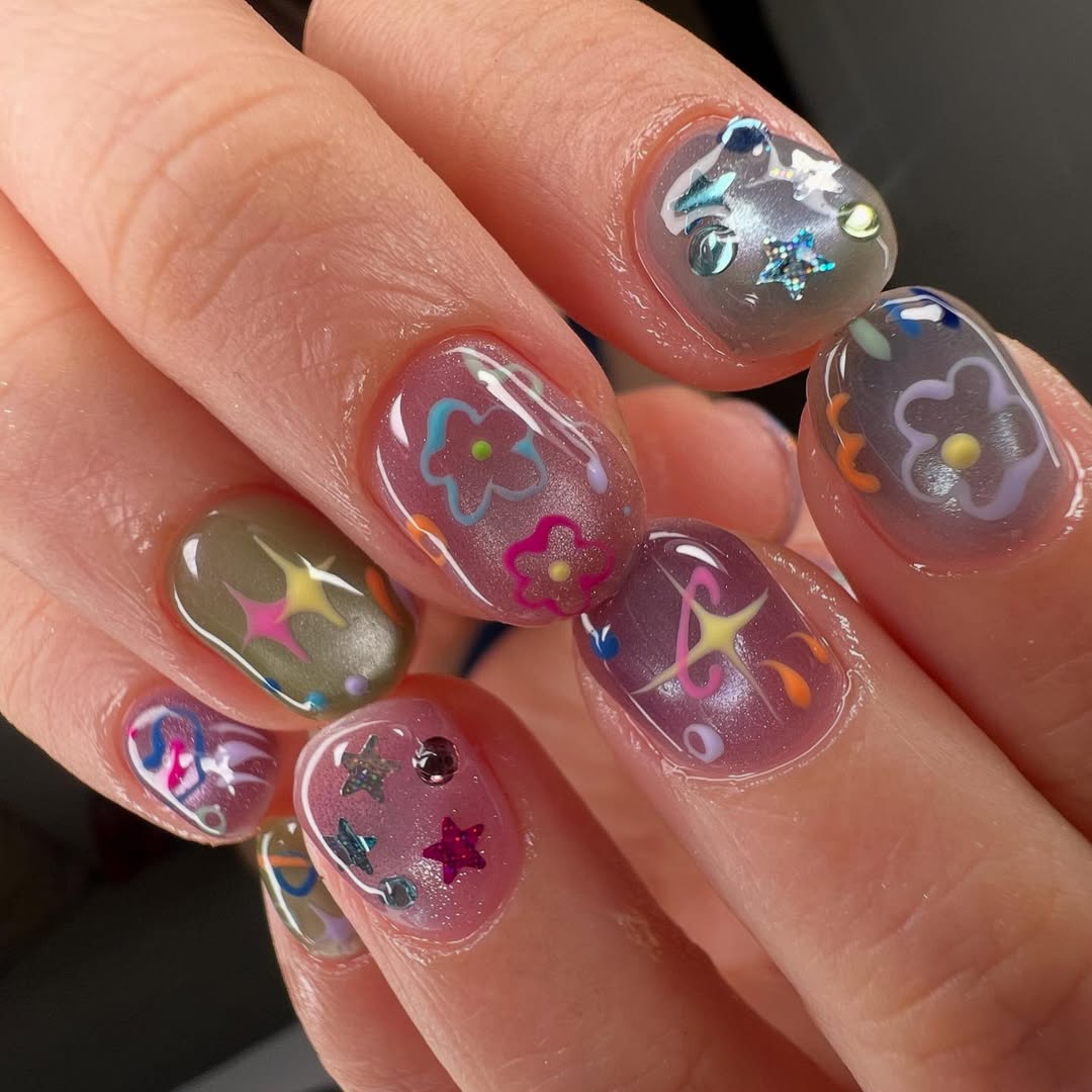 페어리 코어 네일이라고도 불리는 이 디자인은 꽃, 천체, 나비나 과일, 캐릭터 등을 주요 테마로 삼으며 파스텔 톤을 즐겨 사용합니다. 글리터부터 그러데이션, 엠보싱, 파츠와 스티커 등 기발한 기법과 디자인 요소를 적극 활용하죠.