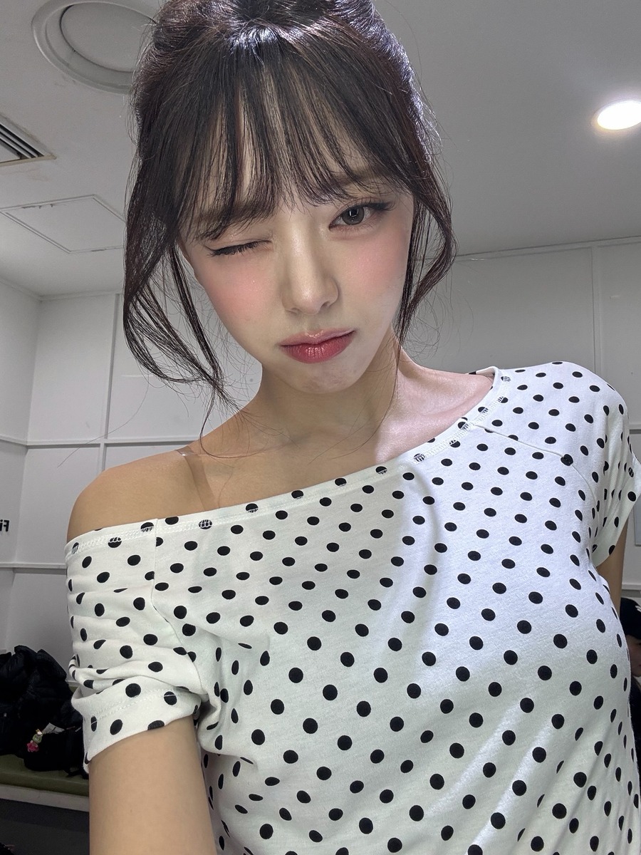솔라는 도트 스커트와 사랑에 빠진 것 같습니다. 지난 대만 여행에서는 엉덩뼈가 드러나는 로라이즈 스커트로 귀여우면서도 섹시한 분위기를 뽐내더니, 최근엔 화이트 스커트로 상큼한 매력을 발산했어요. 공통점은 상의는 블랙 컬러로 선택해 시크한 무채색 룩에 도트로 포인트를 주었다는 것입니다.