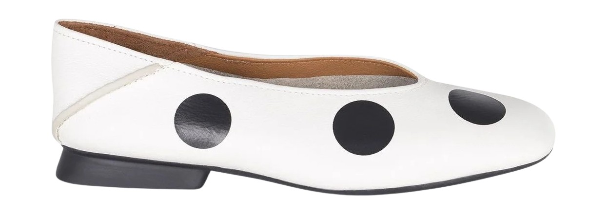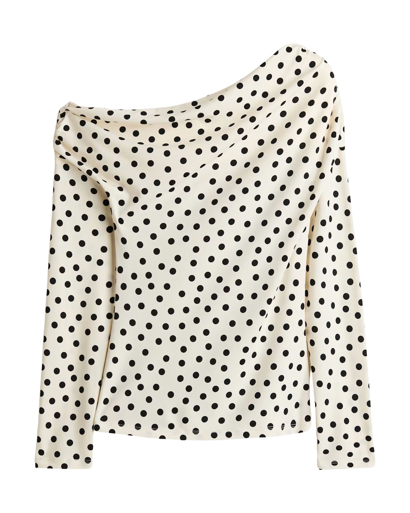 같은 화이트에 검정 도트라도 넥라인에 따라 분위기가 확 달라집니다. 보트넥 반팔 티셔츠를 원오프 숄더로 연출한 유나의 룩을 참고하세요. 원피스보다 캐주얼하지만 사랑스러운 분위기도 놓치지 않죠.