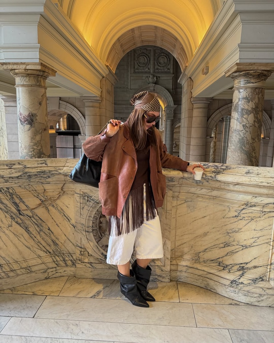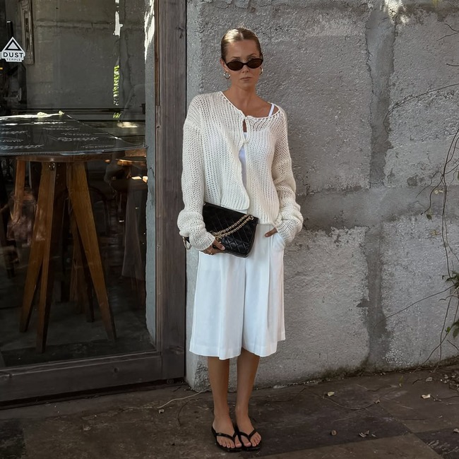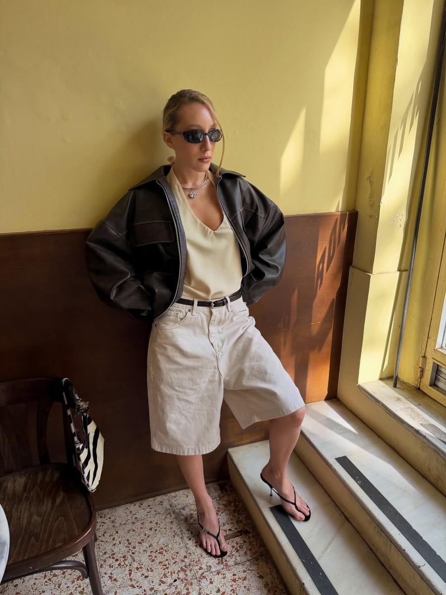 빳빳한 화이트 데님 소재의 쇼츠에 부드러운 캐시미어, 파인울 혹은 짜임이 굵은 여름 니트를 매칭해보세요. 이때 니트 컬러는 크림, 오트밀, 샌드 베이지 등 따뜻한 뉴트럴 컬러로 톤을 맞춰주면, 애써 꾸미지 않은 듯 자연스럽고 부티 나는 럭셔리 룩으로 완성될 거에요.