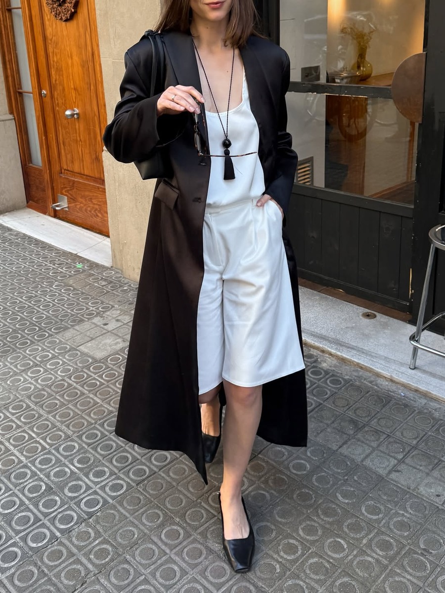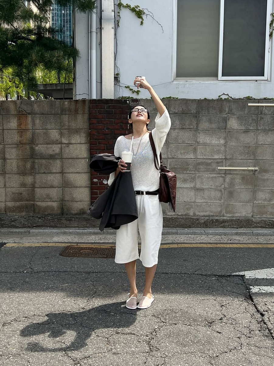 화이트 데님 쇼츠의 경우 거친 느낌을 중화하려면 디테일이 슬랙스에 가까워야 해요. 허리선 아래로 우아하게 잡힌 핀턱 주름이나 정장 바지처럼 잡힌 칼주름 디테일이 시선을 세로로 길게 연장해 주어 포멀하고 고급스러워 보이거든요. 또한, 밑단이 지저분하게 풀린 헤짐 디테일보다는 깔끔한 마감을 선택해야 전체적인 스타일링이 고급스럽게 보일거에요.