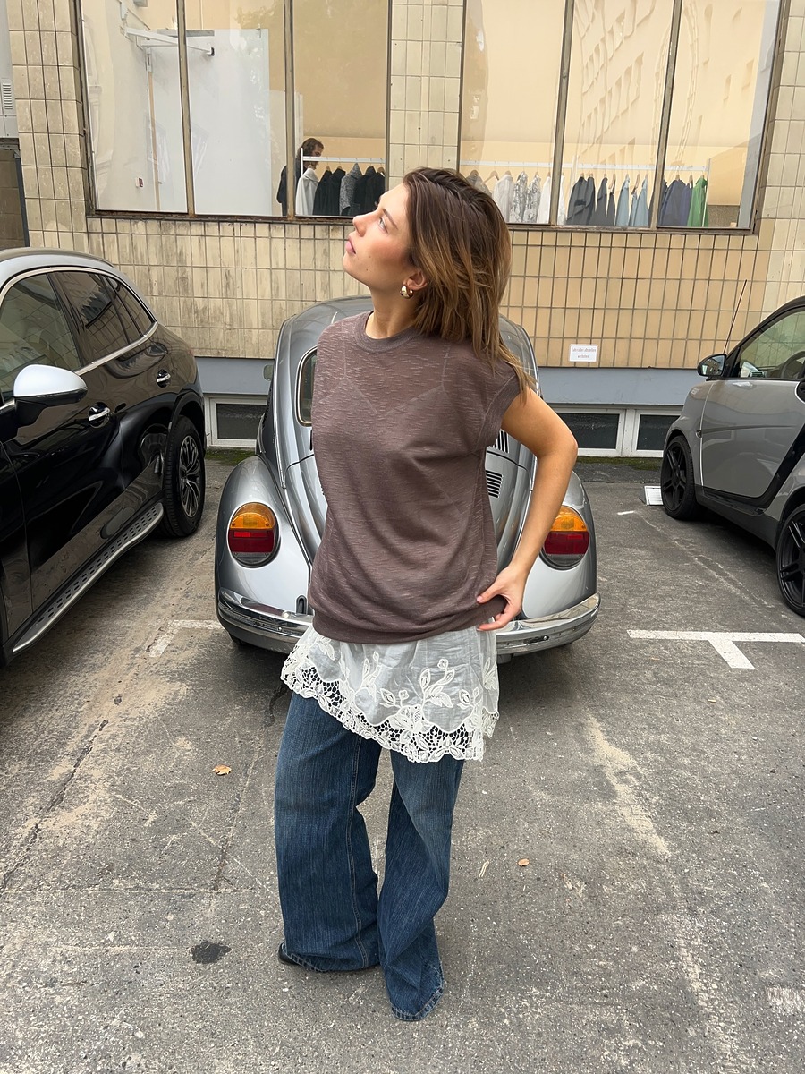 중청 데님의 활용도는 무궁무진합니다. 넉넉한 실루엣의 중청 데님 위에 레이스 스커트를 겹쳐 입어 스칸트 룩을 연출해 보세요. 캐주얼한 데님과 여성스러운 레이스의 대비가 오히려 세련된 긴장감을 만들어냅니다. 레이스 스커트 외에도 슬립 스커트나 새틴 소재의 미디 스커트를 데님 위에 레이어링 하는 것도 좋은 방법인데요. 소재 대비가 클수록 룩의 완성도가 높아진다는 것만 기억하세요.