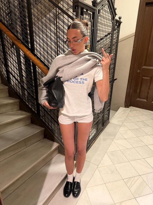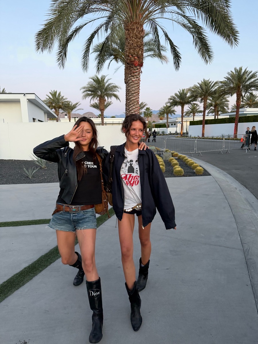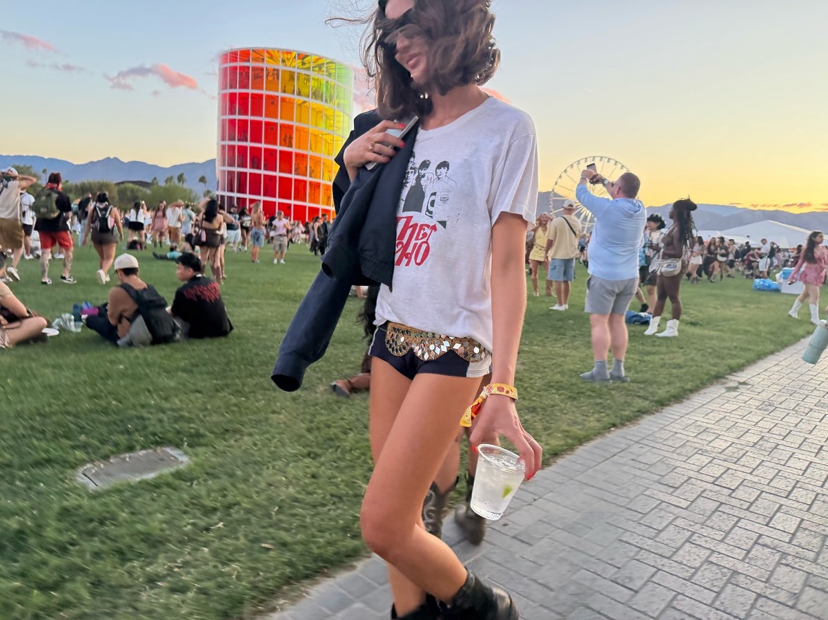 코첼라를 찾은 또 다른 셀럽, 인플루언서 루비 린도 하의실종 룩을 선보였어요. 블랙 마이크로 쇼츠에 펑키한 그래픽이 들어간 티셔츠를 매치하고 블랙 블루종을 매치해 편안함과 스타일을 모두 잡았습니다. 자칫 심심해 보일 수 있는 착장에 스팽글 와이드 벨트와 카우보이 부츠를 더해 웨스턴 무드를 가미했네요.