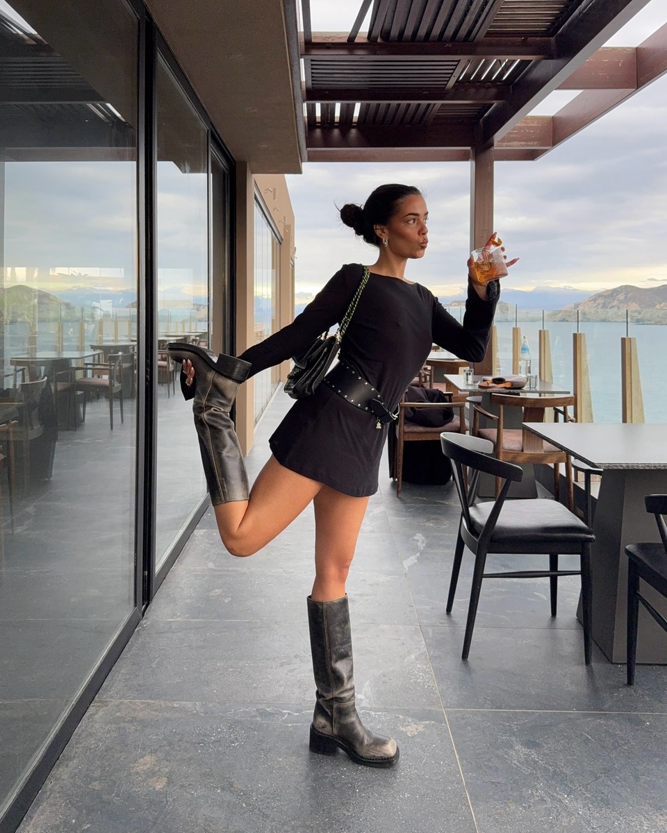 티셔츠와 원피스 사이 아슬아슬한 매력을 자랑하는 마이크로 미니 드레스도 요즘 같은 환절기에 입기 딱 좋은 아이템입니다. 원피스의 기장이 짧은 만큼 액세서리로 허전함을 보완해 줘야 하는데요. 빅 사이즈 벨트를 매치해 실루엣을 잡고 무릎 바로 아래까지 올라오는 롱 부츠를 매치해 다리 노출을 적당히 줄여 보세요. 짧은 기장의 원피스와 롱 부츠 덕분에 비율이 훨씬 좋아 보일 거예요.