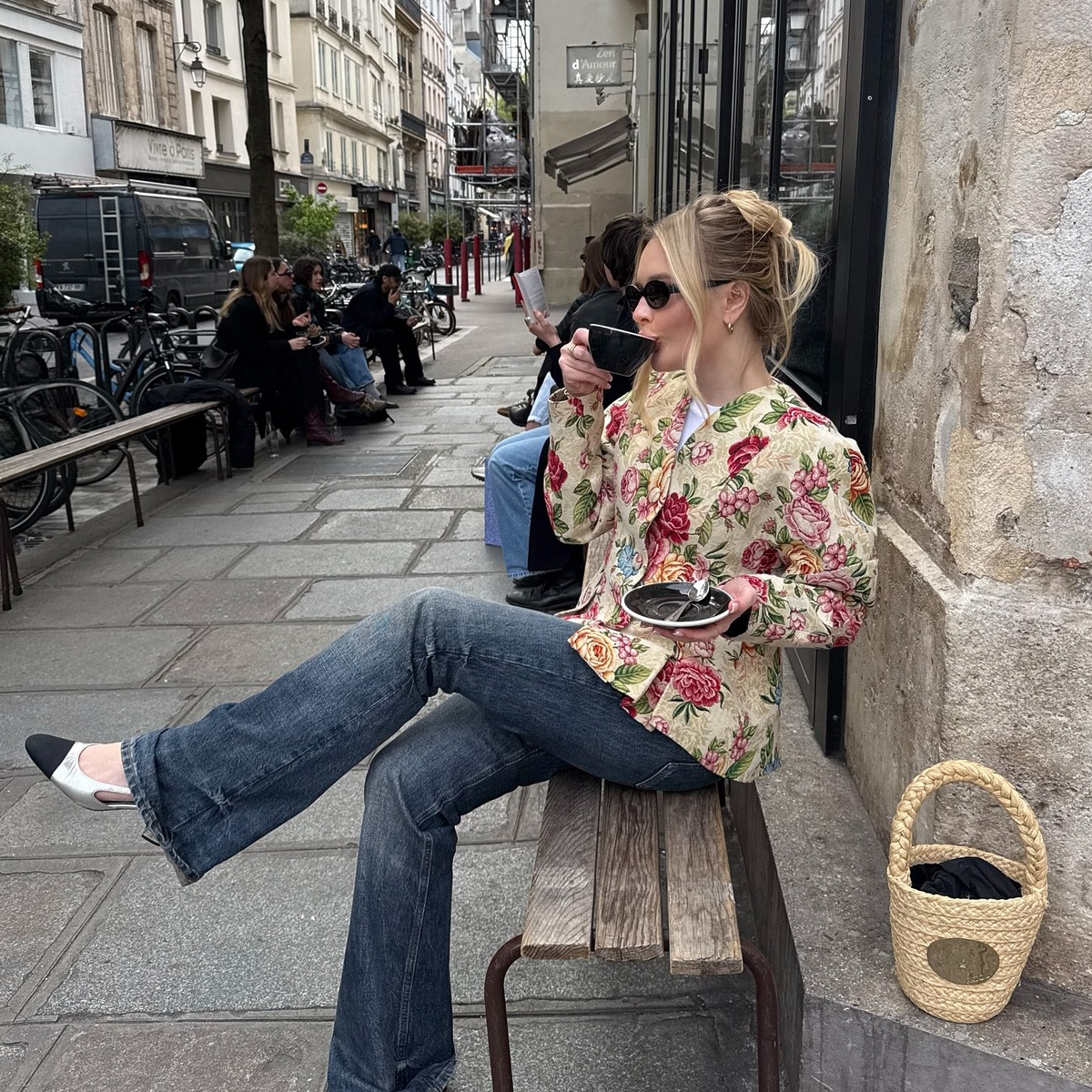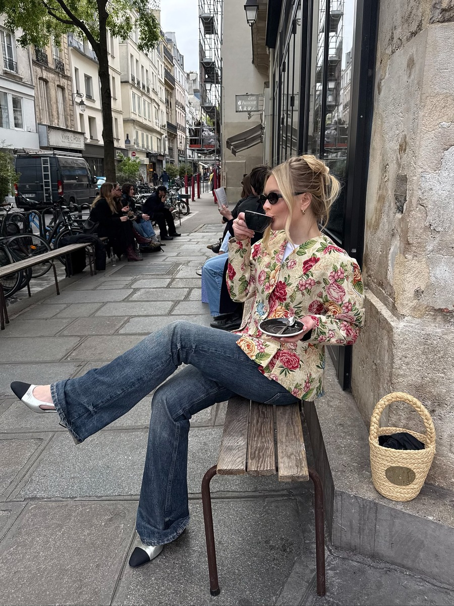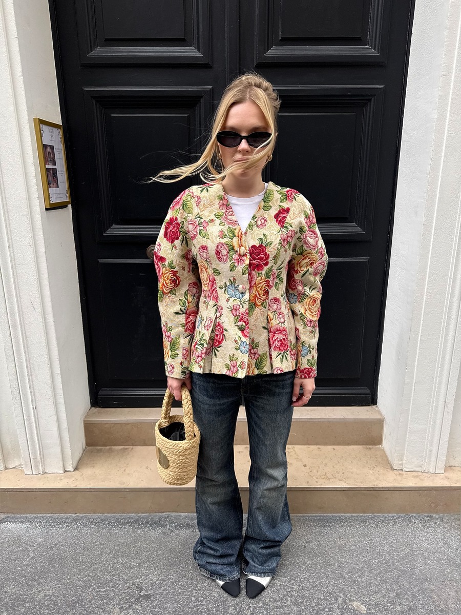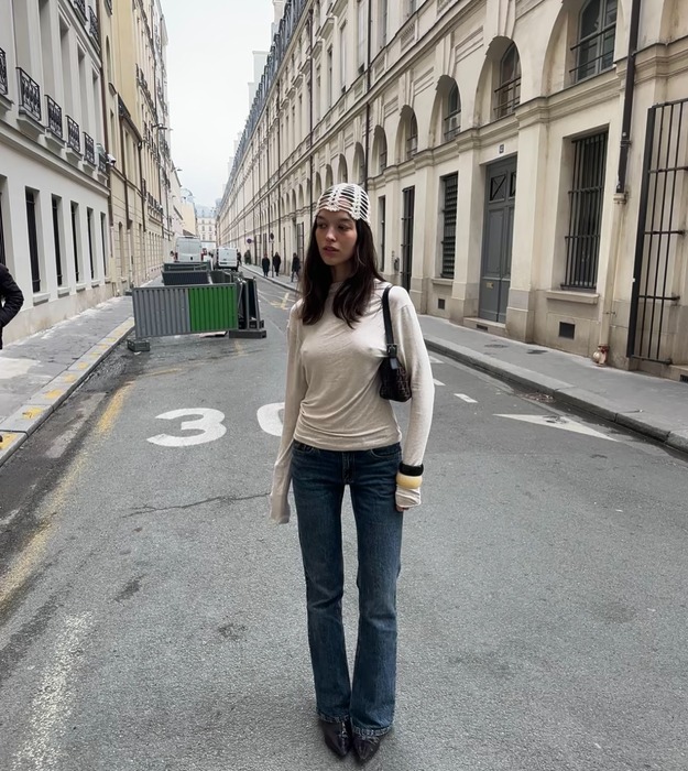 부츠컷 데님이라고 해서 반드시 베이직한 상의만 고집할 필요는 없습니다. 의외로 건축적인 실루엣의 아우터와도 훌륭한 케미를 자랑하거든요. 둥근 어깨 라인이 돋보이는 재킷에 진청 부츠컷을 매치하면 데님도 충분히 우아하게 소화할 수 있어요. 로맨틱한 재킷의 볼륨감과 다리선을 따라 유연하게 흐르는 부츠컷의 실루엣이 교차하며 세련된 데님 룩을 완성합니다.