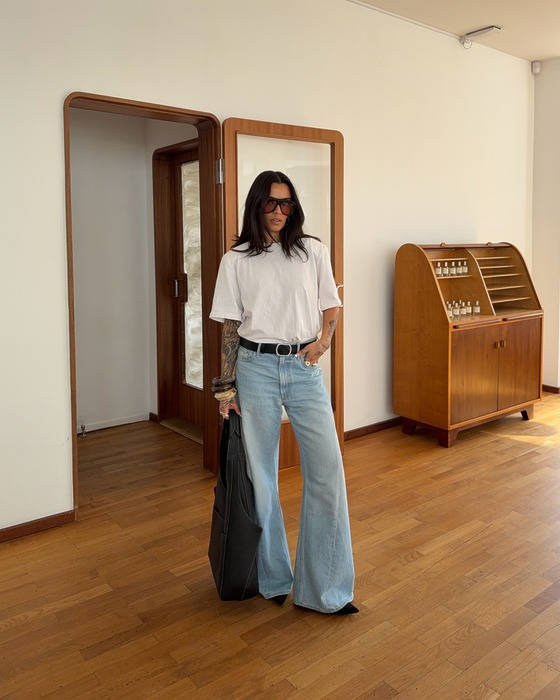 부츠컷 데님은 그 자체로 존재감이 뚜렷하기 때문에 덜어낼수록 멋스러운 아이템입니다. 화려한 디자인보다는 기본 티셔츠처럼 담백한 상의와 조합했을 때 그 매력이 배가 되죠. 여기에 볼드한 뱅글이나 스팽글 미니 백 같은 포인트 액세서리 한두 개만 곁들이면 시간이 지나도 세련된 데님 룩이 완성됩니다. 캐주얼한 무드를 연출하고 싶다면 플리플롭을, 약간의 긴장감을 더하고 싶다면 스텔레토 힐을 매치해 봐도 좋겠군요.