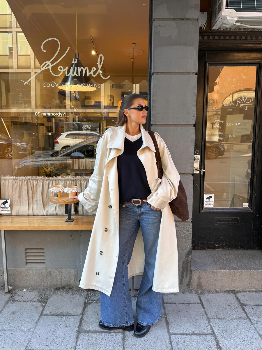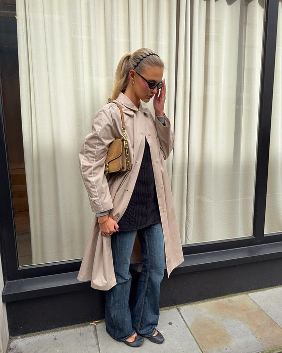 요즘같이 일교차가 큰 환절기에는 부츠컷 데님과 트렌치코트의 조합이 제격. 기장이 긴 아우터는 자칫 비율이 무너져 보일 수 있다는 단점이 있지만, 부츠컷과 함께라면 이야기가 달라집니다. 밑단으로 갈수록 넓어지는 특유의 라인이 시선을 아래로 끌어내려 하체를 길어 보이게 만들어 주기 때문이죠. 이때, 지나치게 높은 힐을 신어 힘을 주기보다는, 플랫슈즈나 로퍼로 무심한 듯 가볍게 마무리하는 것이 세련된 스타일링의 키 포인트라는 걸 기억하세요.