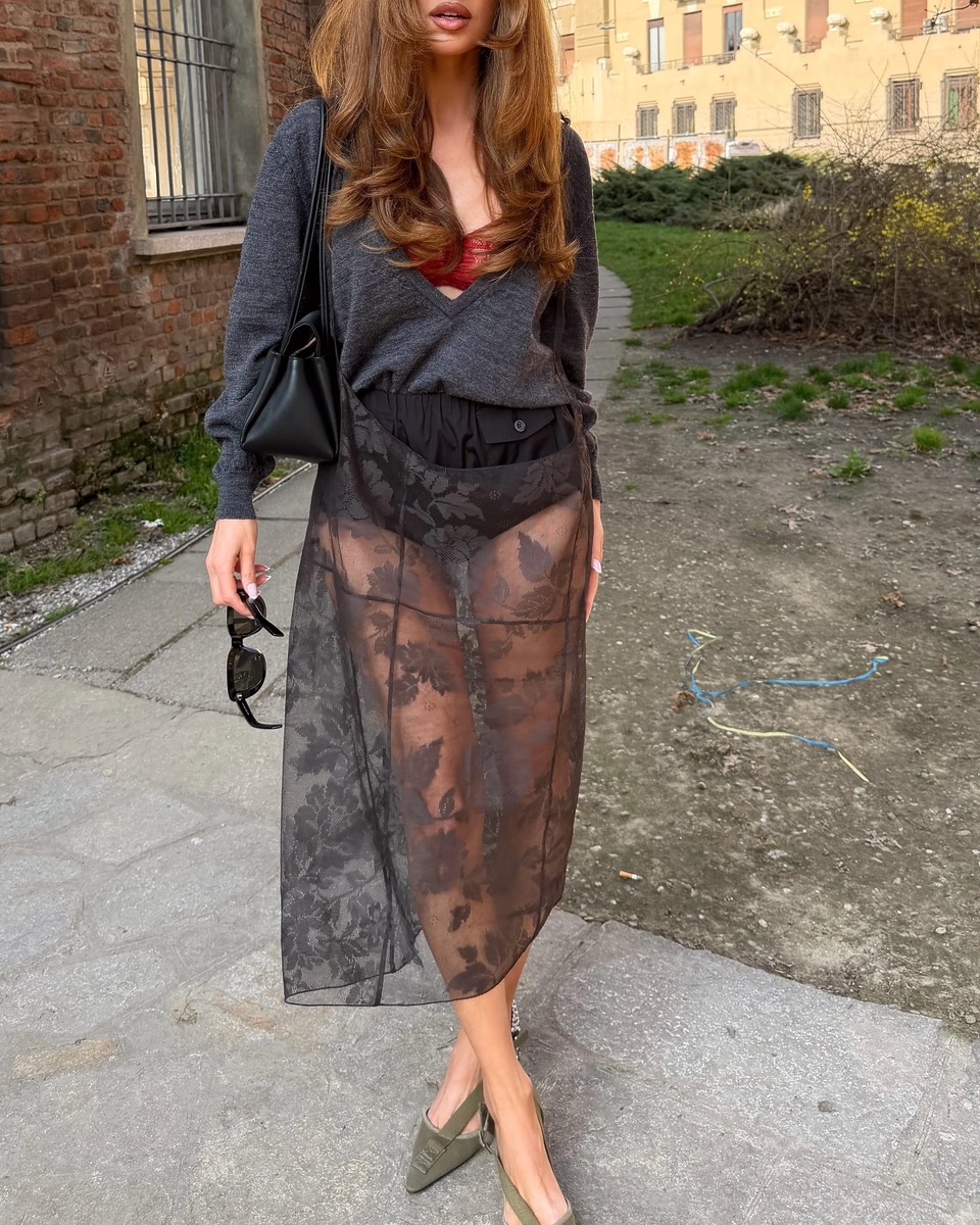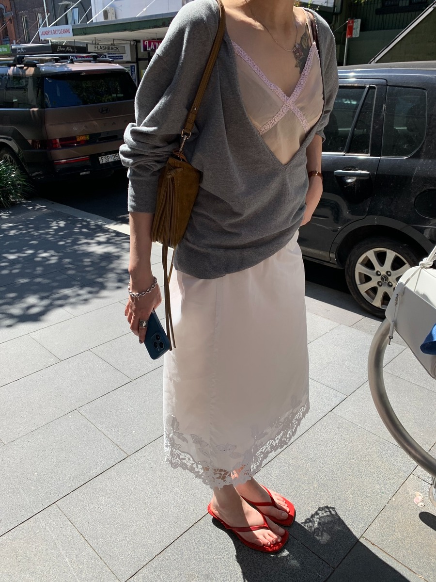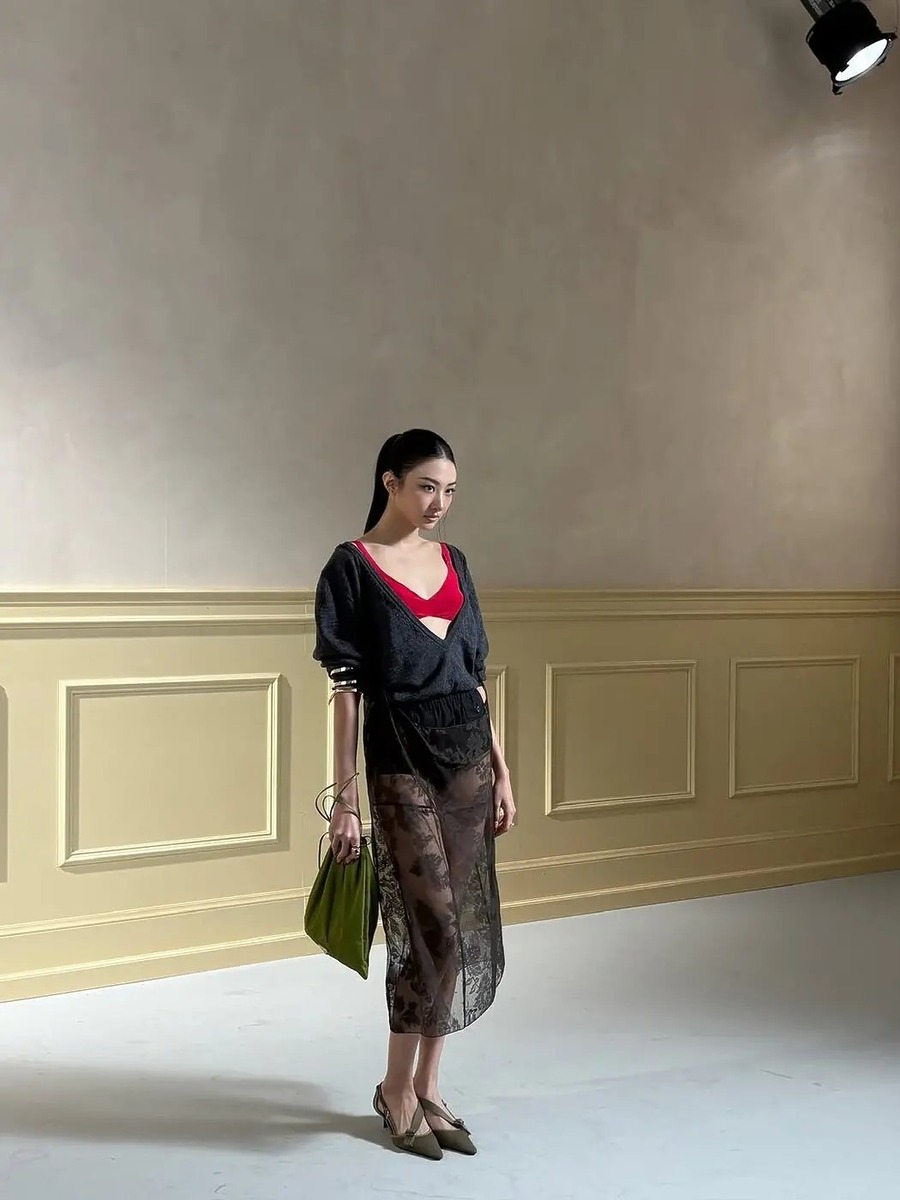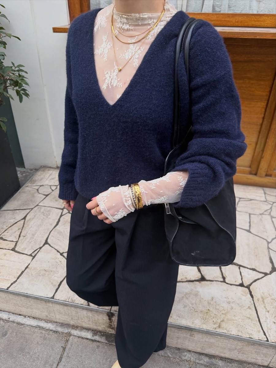 이번 시즌 딥 브이넥 니트를 즐기는 가장 확실한 공식은 란제리 레이어링입니다. 섬세한 레이스 브라톱이나 슬립 원피스 위에 니트를 가볍게 걸쳐보세요. 자칫 과해 보일 수 있는 란제리의 관능미 위에 단정한 니트가 더해지며 룩의 균형을 완벽하게 잡아줍니다. 포근한 니트와 얇고 섬세한 레이스 소재가 대비되며 입체적인 스타일링을 완성합니다.