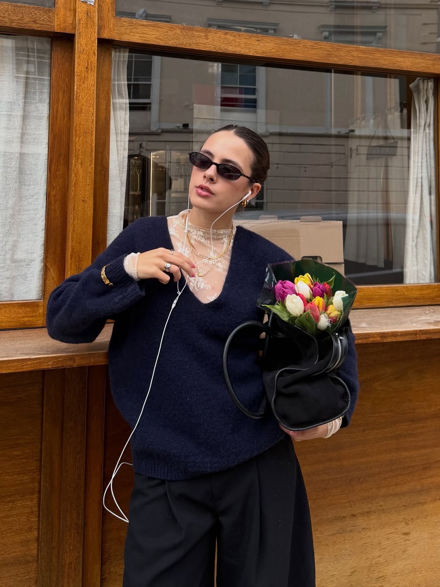 넥라인 하나로 관능과 우아함을 넘나드는 딥 브이넥 니트의 매력.