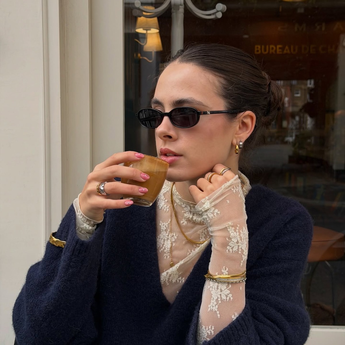 란제리 노출이 부담스럽다면 시스루 레이스 톱을 활용하는 것도 좋은 방법입니다. 화이트 레이스 톱 위에 네이비 니트를 매치하는 식으로 두 아이템의 컬러를 확실하게 대비시키면 훨씬 정돈된 인상을 줄 수 있어요. 레이스 특유의 섬세한 패턴이 깊게 파인 넥라인과 만나 우아함을 배가시킵니다. 깊은 넥라인 때문에 목 부분이 허전해 보인다면 다양한 길이의 목걸이를 레이어드해 보세요. 시선이 분산되면서 스타일링의 완성도가 한층 올라갈 거예요.