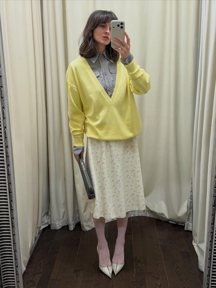 딥 브이넥 니트는 오피스 룩으로도 제격입니다. 란제리나 레이스 대신 셔츠를 이너로 선택하면 단정한 오피스 웨어가 완성되죠. 화사한 옐로 컬러 니트에 차분한 블루 셔츠를 매치해 보세요. 깊게 파진 넥라인 덕분에 답답해 보이지 않고, 화사한 컬러로 한결 가볍고 경쾌한 봄 스타일링을 연출할 수 있답니다.