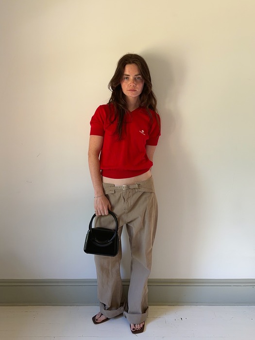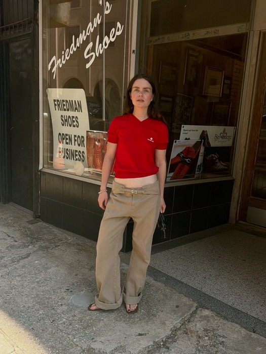 레드 반팔 니트에 브라운 팬츠를 매치한 룩에 플리플롭 힐을 더하면, 편안하면서도 단정한 무드가 동시에 완성돼요. 이때 포인트는 바짓단으로 힐을 살짝 덮어주는 것! 발등을 덮어주면 키가 훨씬 커 보이는 효과까지 덤으로 따라옵니다. 이때, 바짓단이 너무 짧으면 키가 작아 보이고, 너무 길면 발이 묻혀버리니 팬츠의 기장은 발등을 가볍게 덮는 정도로 맞춰주세요.