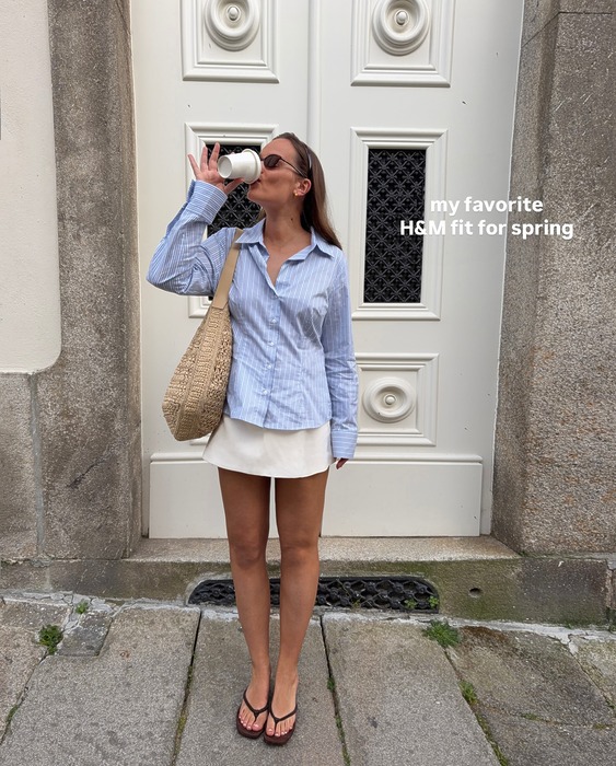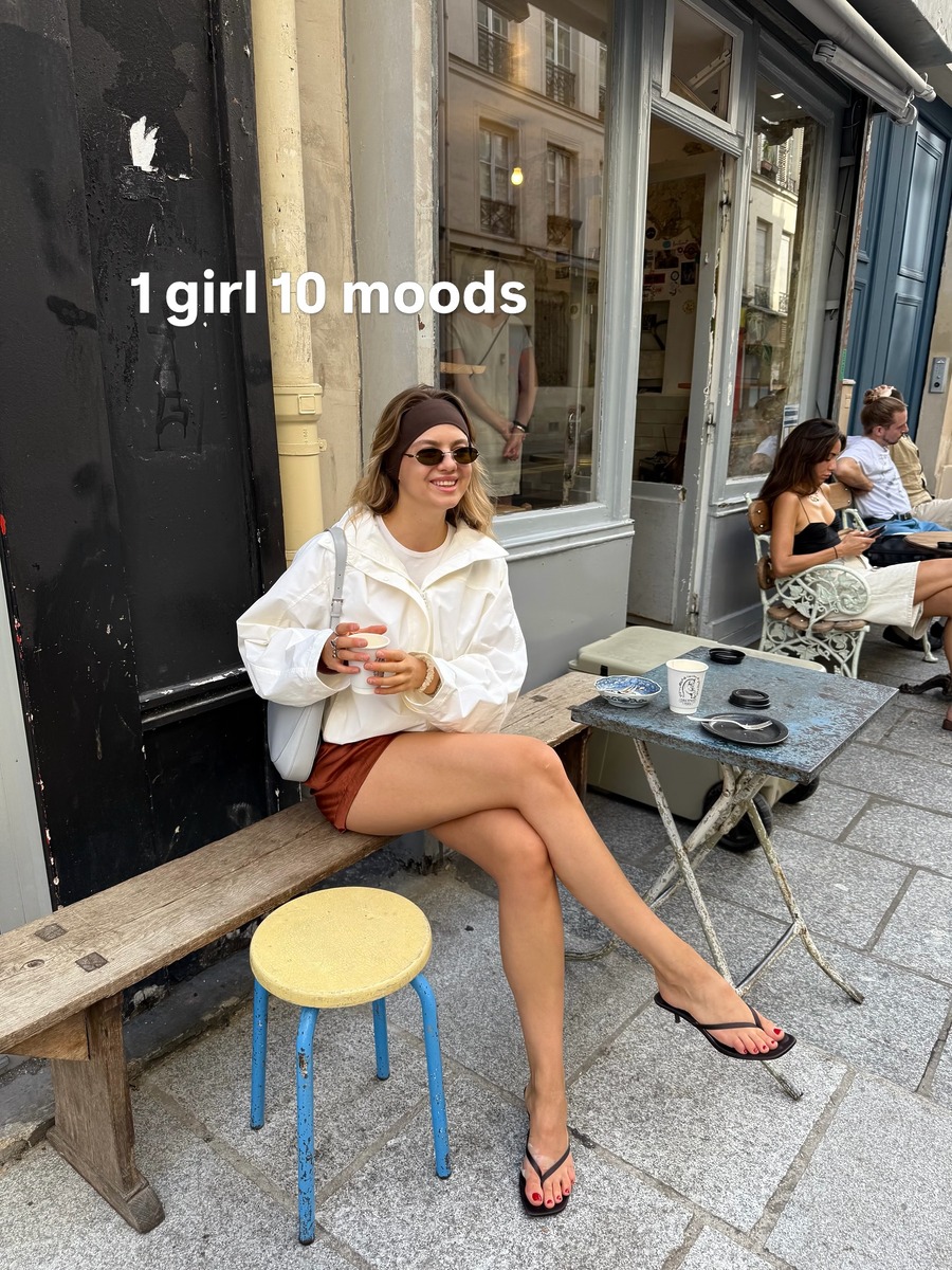 윈드브레이커에 쇼츠, 헤어 밴드까지 완성된 스포티한 룩에 플리플롭 힐이라니, 다소 이질적인 조합이지만 의외의 매력을 뿜어냅니다. 스포티함은 그대로인데, 플리플롭 힐 하나로 페미닌함이 한 스푼 더해지며 완전히 다른 룩이 완성되죠. 스니커즈로 마무리한 뻔한 스포티 룩 대신 긴장감이 느껴지는 세련된 스타일링을 연출해 보세요.