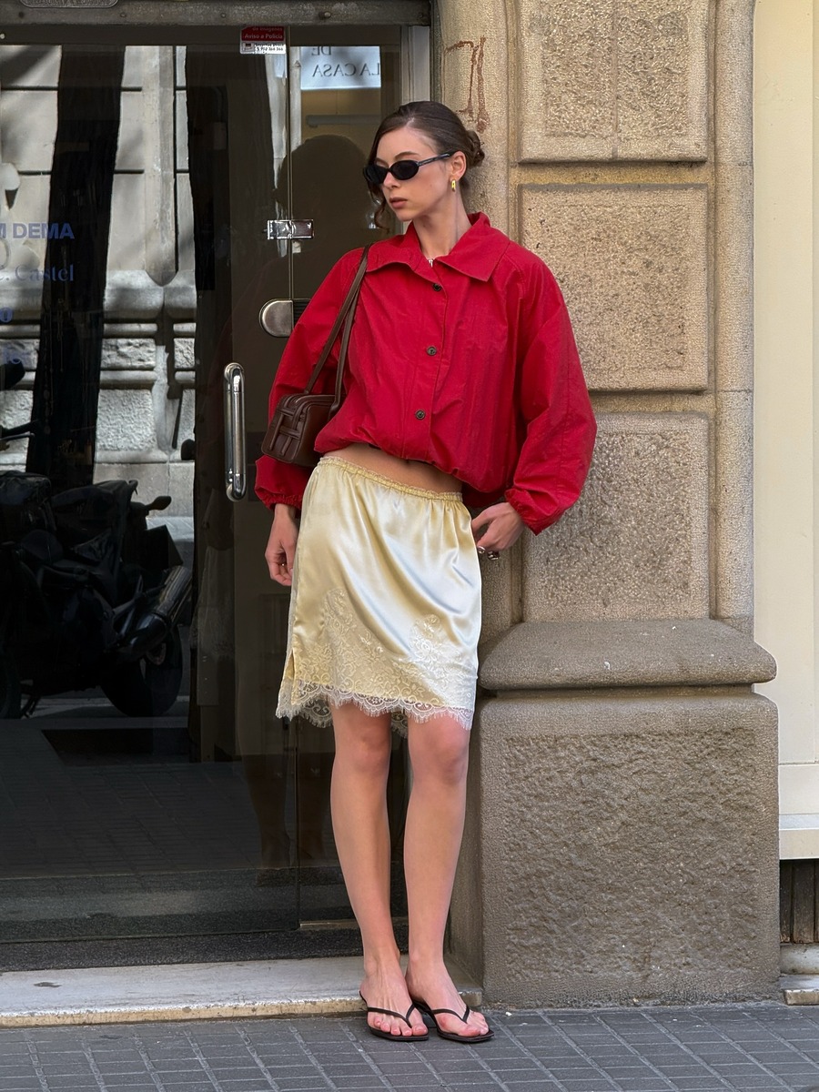 스커트의 실루엣만큼이나 소재도 중요해요. 얇고 가볍게 흘러내리는 실크 소재의 스커트에 가는 플리플롭 힐을 매치하면 두 아이템의 섬세함이 절묘하게 어우러지며 세련된 무드가 완성되죠. 상의로는 크롭 탱크나 슬립 톱처럼 얇은 소재로 맞춰주면 전체 룩의 가벼운 텍스처가 통일되며 룩의 완성도가 올라갑니다.