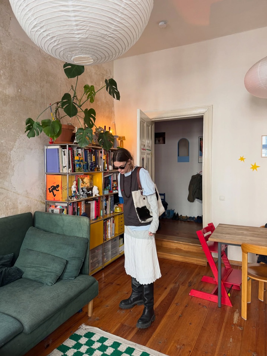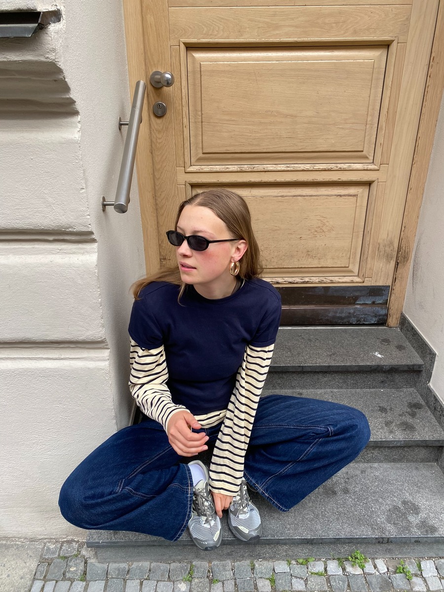 레이어드 스타일링이 어렵게 느껴진다면, 패턴을 활용하는 것도 좋은 방법. 스트라이프 롱 슬리브는 레이어드에 빠질 수 없는 아이템입니다. 아이보리&블랙 스트라이프 티셔츠에 네이비 반팔 티를 레이어드하면 깜찍한 데일리 룩이 완성됩니다. 스트라이프가 주는 경쾌함 덕분에 자칫 밋밋해 보일 수 있는 룩에 리듬감이 느껴지죠.