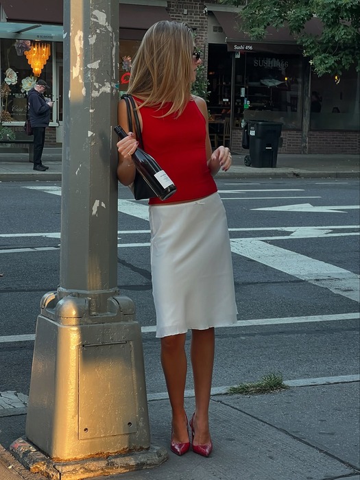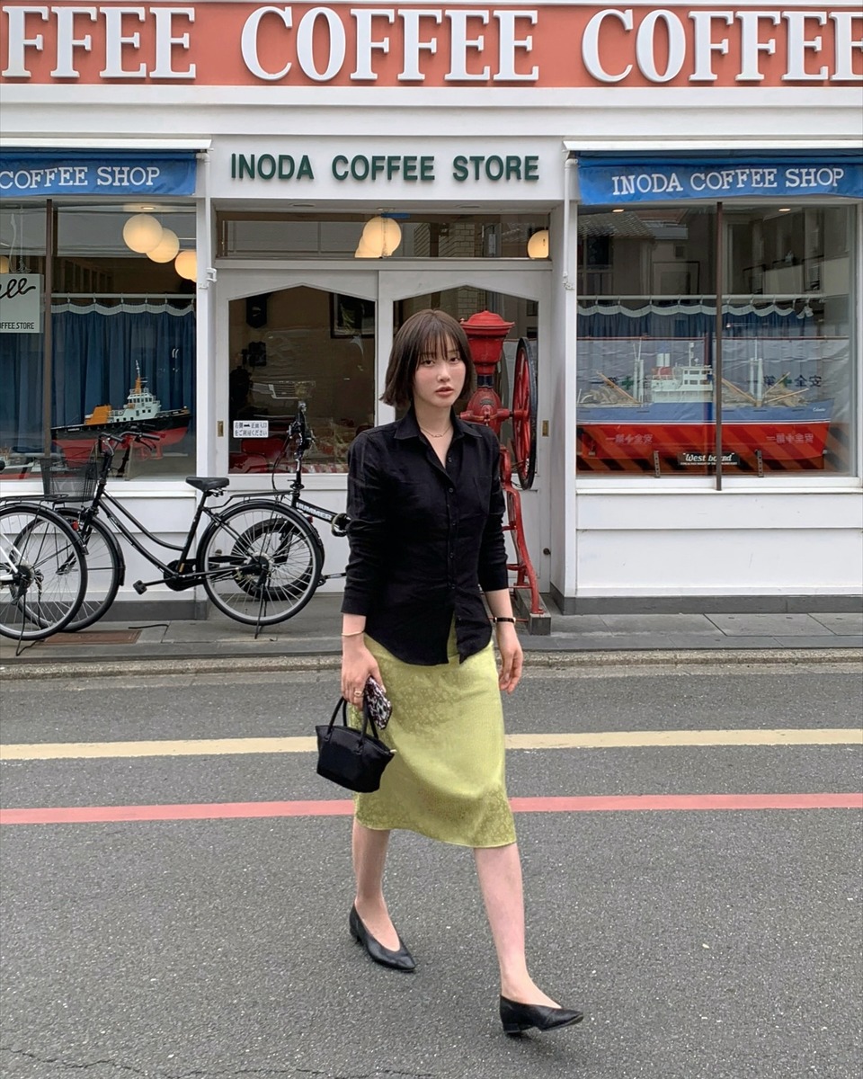 30대 여성 직장인이 애용하는 아이템 중 하나라는 ‘미디스커트’가 트렌드 아이템이 되었다?! 올봄/여름 스커트 길이는 너무 짧지도, 길지도 않은 무릎 언저리에서 끝나는 ‘니렝스’ 길이 스커트가 대세입니다. A 라인이나 플리츠 스커트보다는 심플한 H 라인이, 그리고 실크 소재나 자카드 등 고급스러운 원단을 사용한 것이 인기로 성인 여성들이 오피스 룩은 물론, 중요한 자리에 활용하기 아주 좋죠. 요즘 같은 간절기에는 블라우스나 셔츠와 함께 매치해 입기 좋고 날이 좀 더 더워지면 목이 살짝 올라오는 슬리브리스 니트와 입어주면 프렌치 시크 룩을 완성할 수 있습니다.