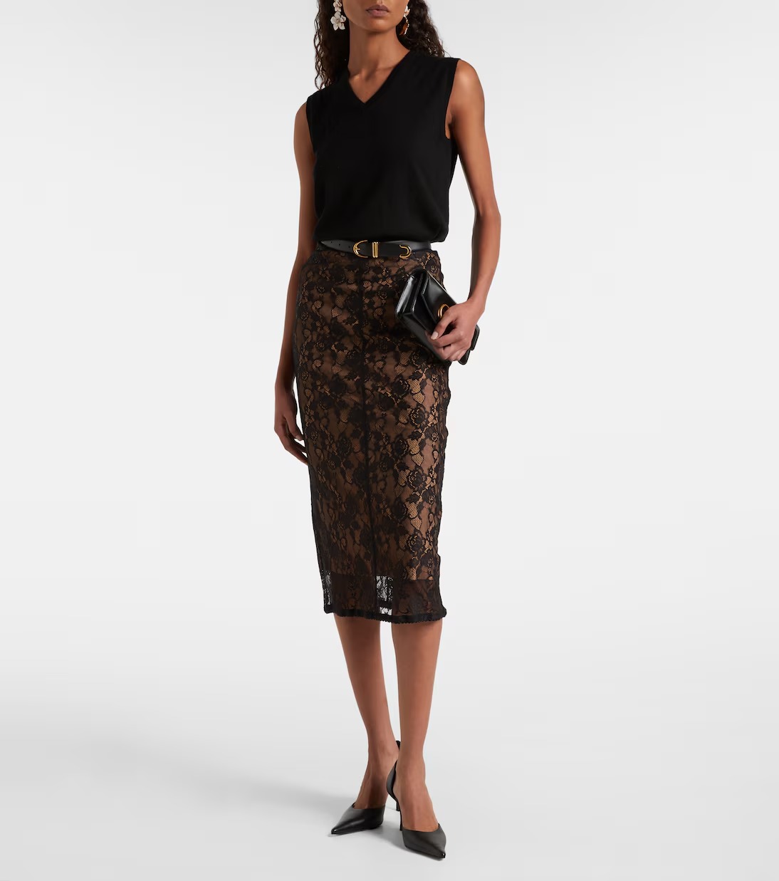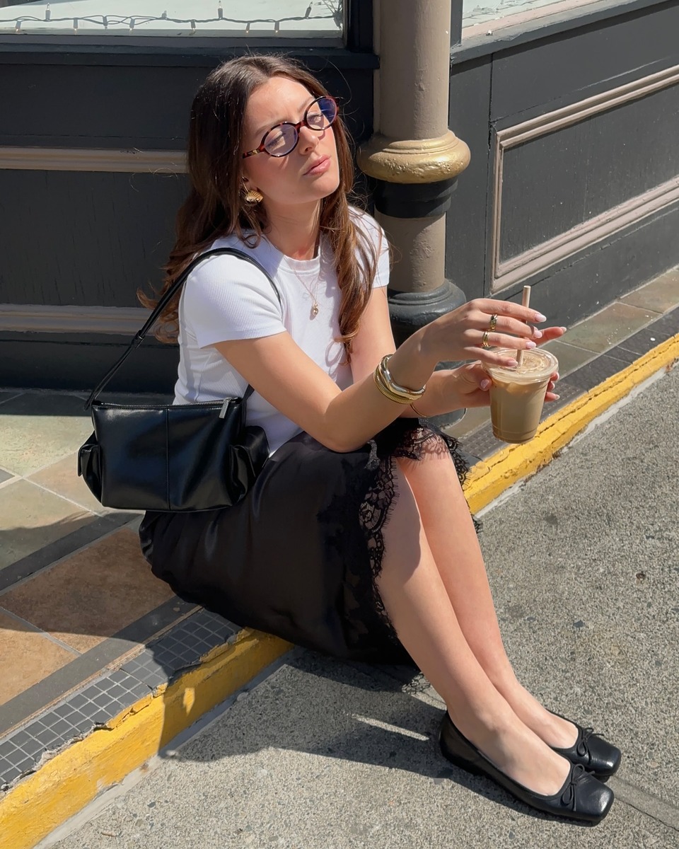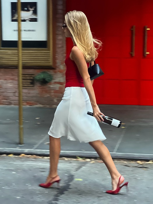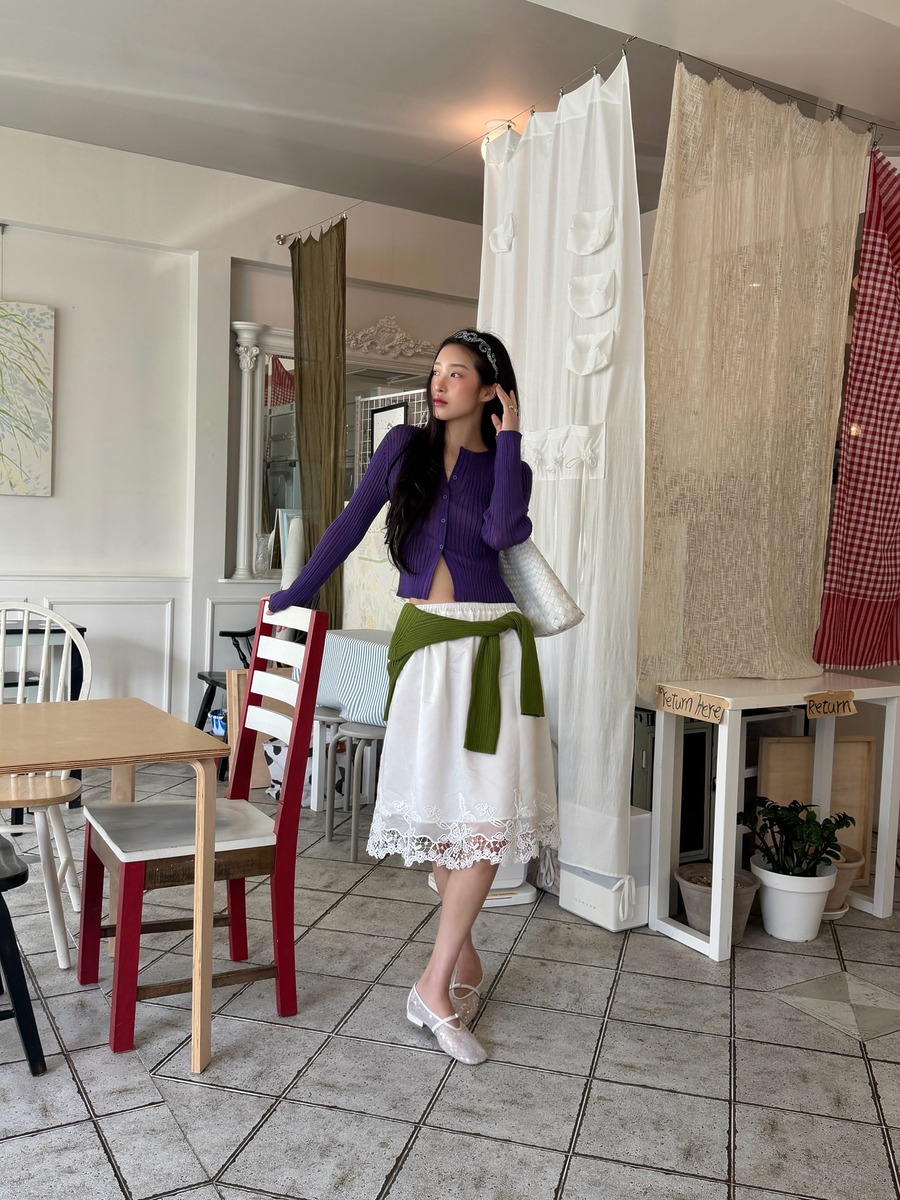 26 봄/여름 시즌의 미디스커트 특징 중 하나는 헴라인에 레이스가 더해진 디자인이 많다는 점이죠. 이는 이전부터 꾸준한 인기를 얻고 있는 ‘란제리 룩‘의 영향으로 보입니다. 란제리 룩 유행에 탑승하고 싶었으나 다소 노출 있는 상의가 부담스럽게 느껴졌던 이들이라면 이런 스커트로 도전해 보는 것도 괜찮겠죠? 여기에 뿔테 안경을 더해주면 포엣 코어까지 챙길 수 있습니다.