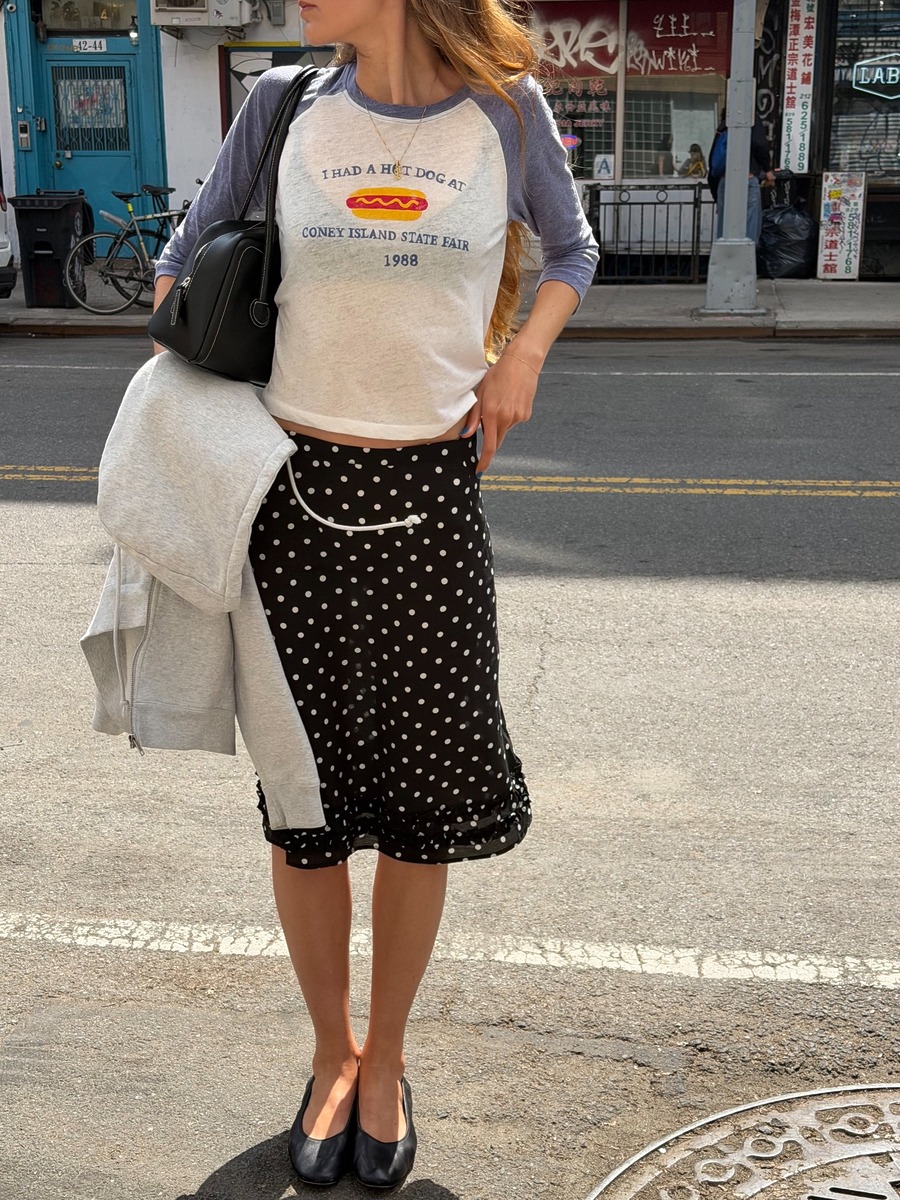 요즘 유행하는 도트 프린트. 하지만 너무 영한 이미지가 강해 시도하기 걱정스러웠다면 미디스커트로 도전해 보세요. 미디스커트 특유의 여성스럽고 우아한 분위기가 폴카도트의 경쾌한 분위기를 중화시켜 줄 거예요. 또, 미디스커트와 재킷을 매치시켜주면 주말마다 고민이던 하객룩도 손쉽게 연출할 수 있습니다.