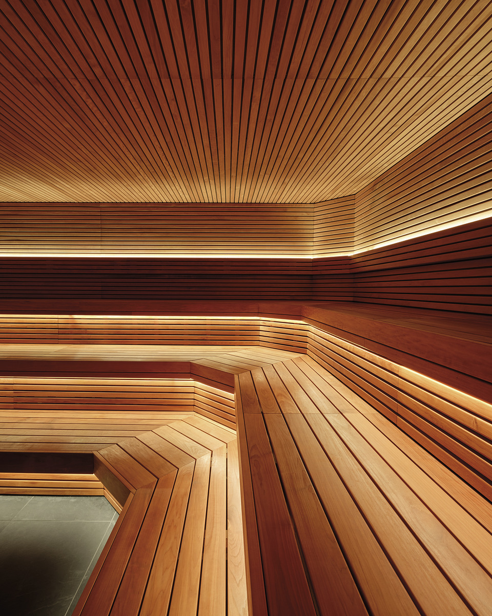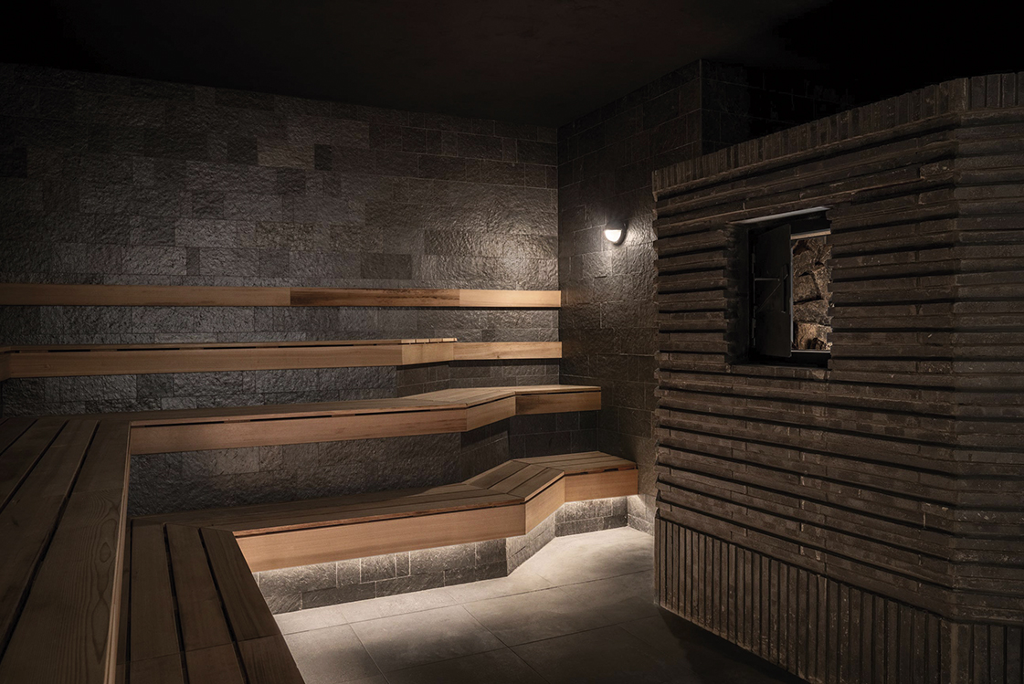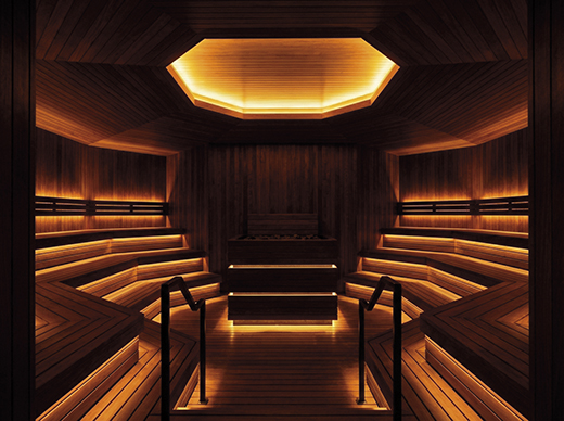 따듯한 목재와 부드러운 조명, 거기에 향과 사운드 같은 감각적 요소를 더해 깊이감 있는 분위기를 느낄 수 있는 생 로슈의 사우나.