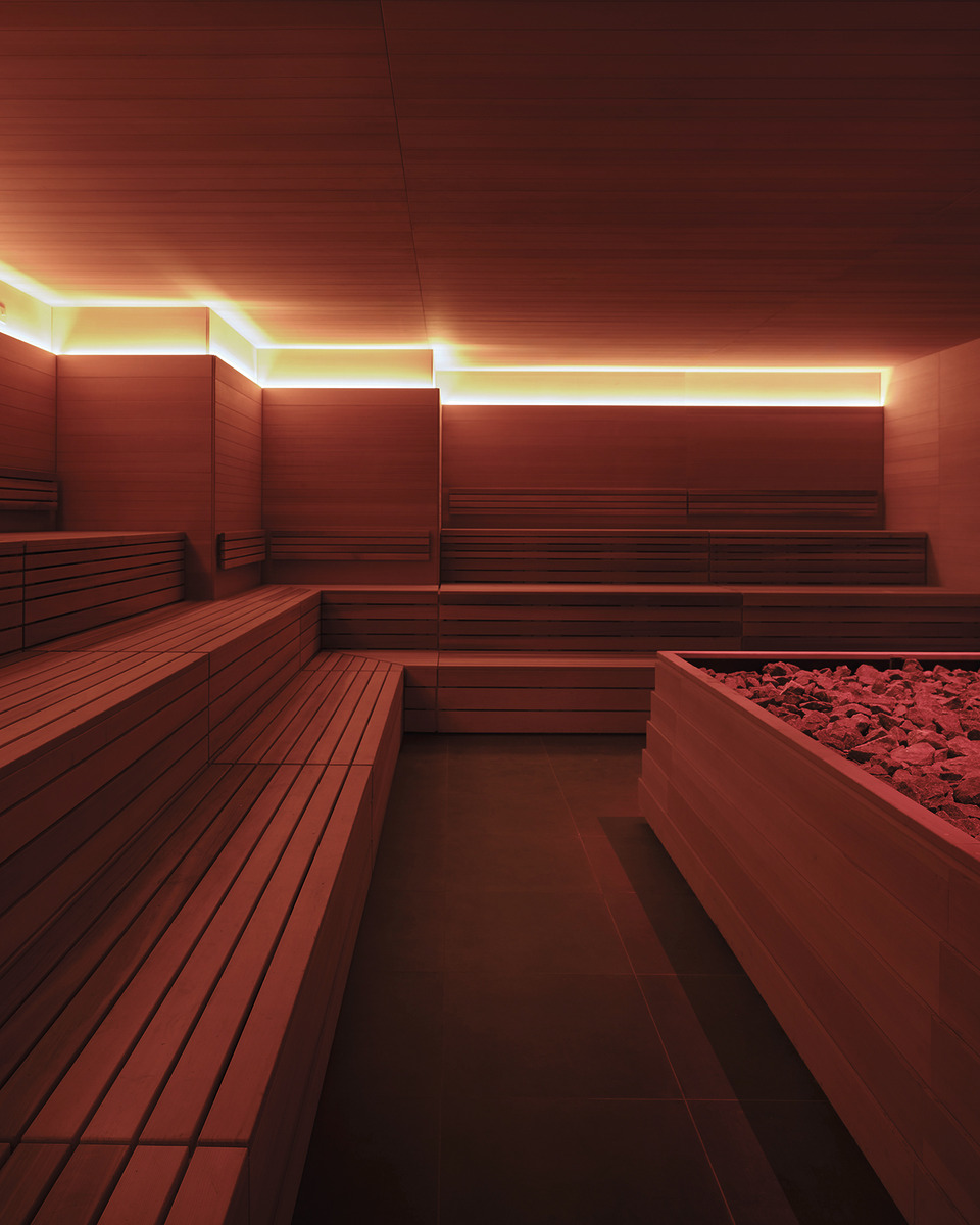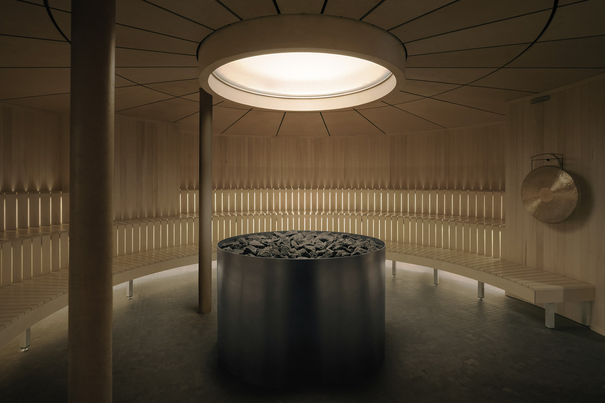 미니멀한 건축미가 돋보이는 리세스 서멀 스테이션 사우나는 중앙에 거대한 금속 스토브를 배치해 깊고 고요한 명상적 휴식을 유도한다.